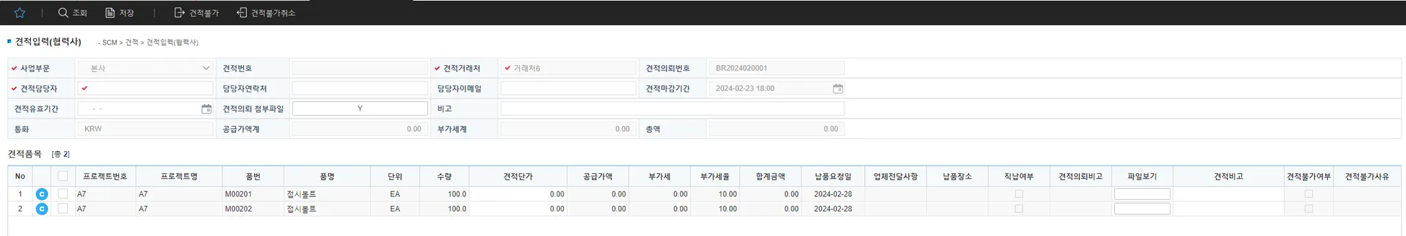 견적의뢰한 품목에 대해 협력사에서 견적을 입력하는 화면입니다.