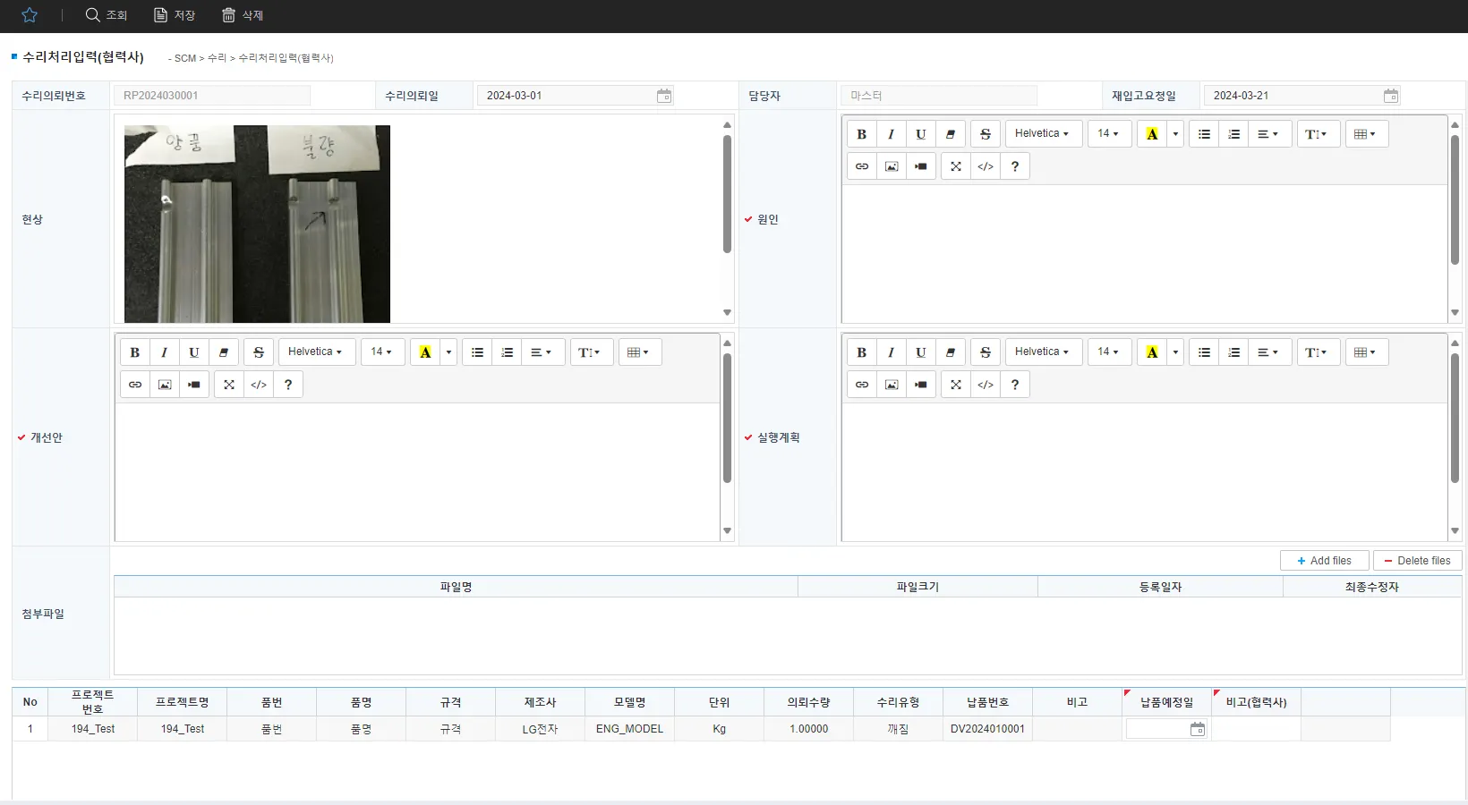 협력사에서 수리의뢰건에 대한 현상을 확인하고 납품예정일 및 처리 내용을 입력합니다.