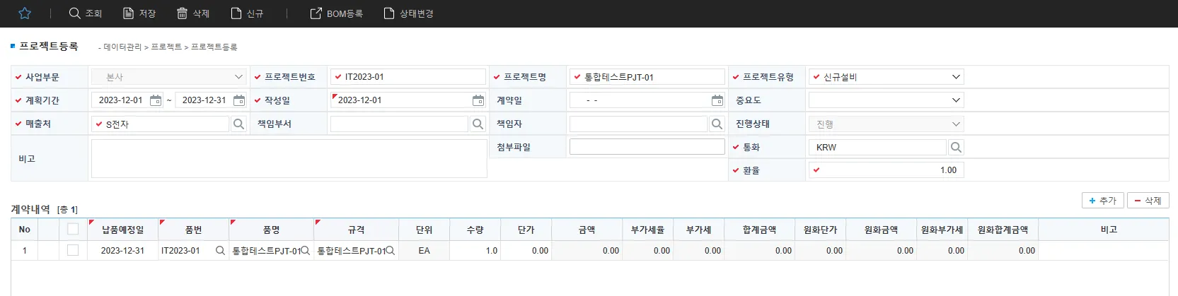 프로젝트 저장시 계약내역이 없는 경우 품목 자동 생성 및 등록