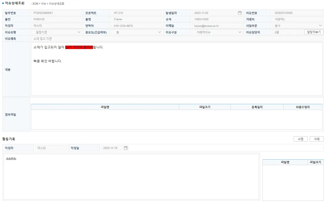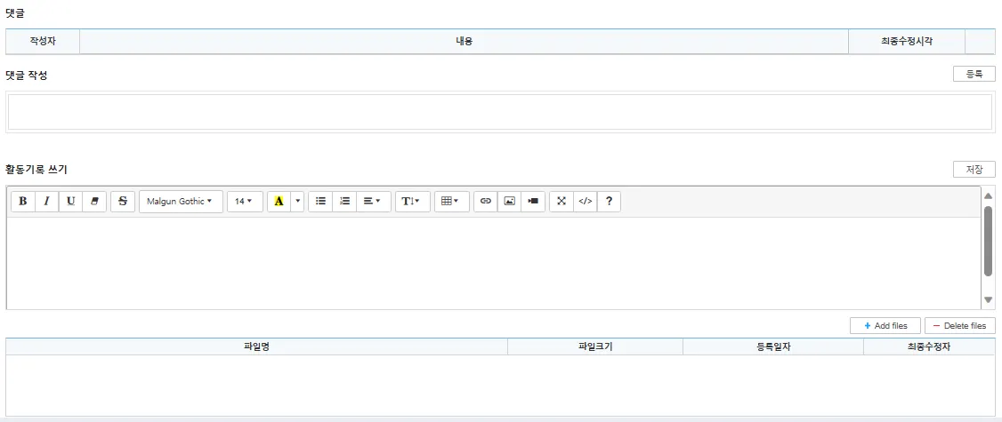 활동기록 : 해당 이슈의 활동기록을 입력하여 진행현황을 공유 및 관리할 수 있습니다.