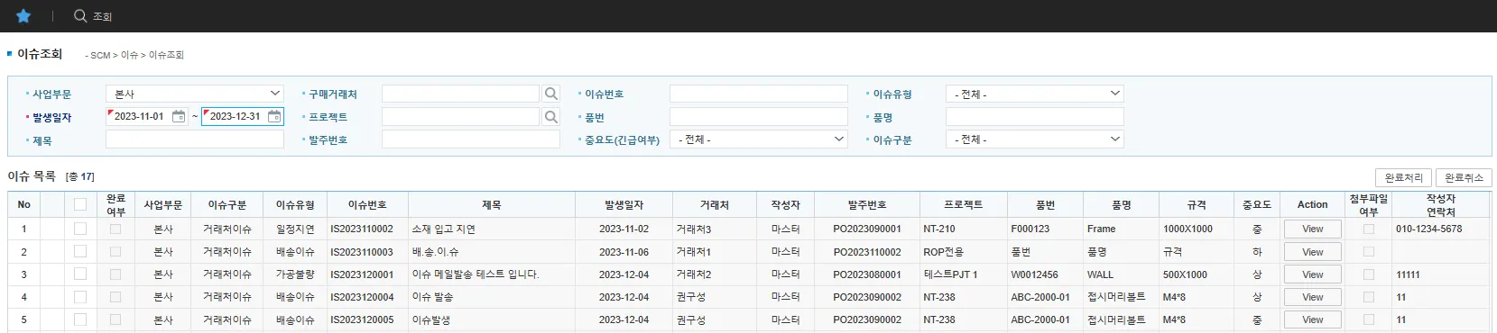 조회된 행을 더블클릭하면 [이슈등록]화면으로 Jump할 수 있습니다.