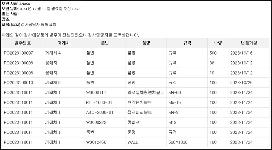 발주확정된 검사대상품목에 대해 검사담당자가 입력되지 않은 품목리스트 Mail을 받을 수 있습니다.