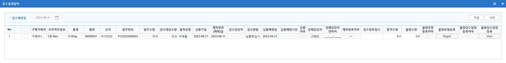 [검사계획등록]에 입력한 계획일 기준으로 조회하고 검사결과를 입력하는 화면입니다.