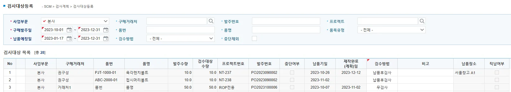 발주확정된 품목 중 검사대상을 선정하는 화면입니다.