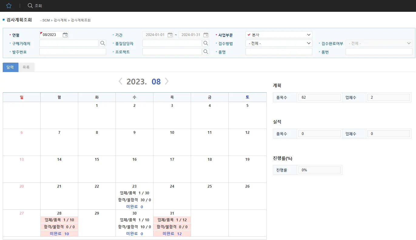 검사계획일이 지나도록 검사결과가 입력되지 않은 품목이 있는 날짜는 붉은색 배경색 표시