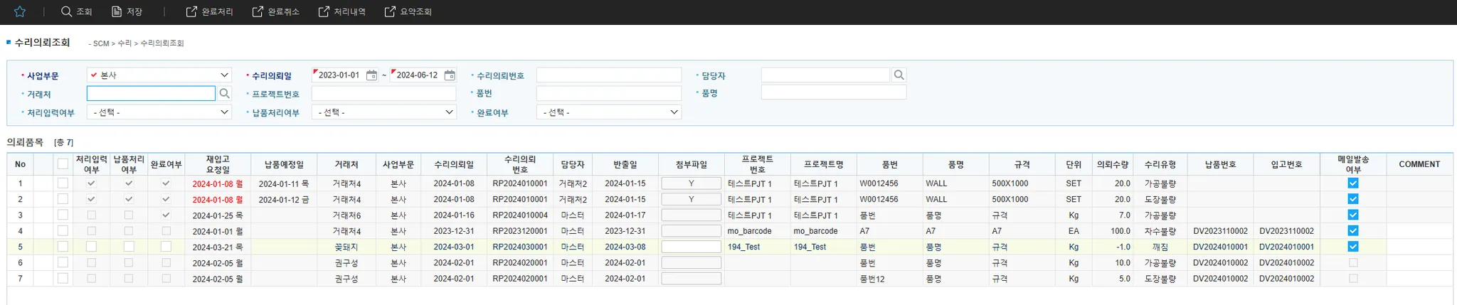 수리의뢰건에 대한 진행현황을 조회하고 완료처리를 할 수 있습니다.