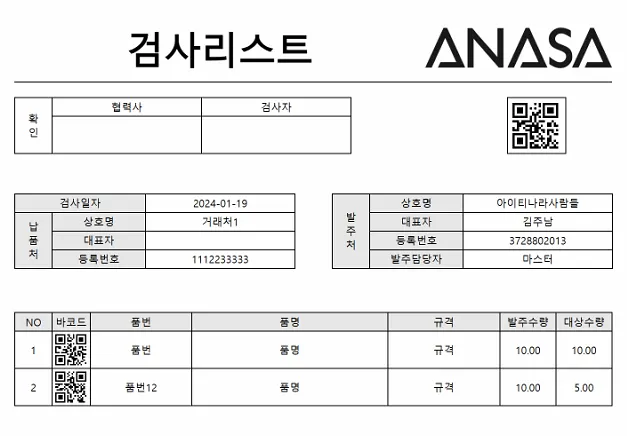 검사대상품에 대해 바코드로 검사결과 입력을 위한 출력물