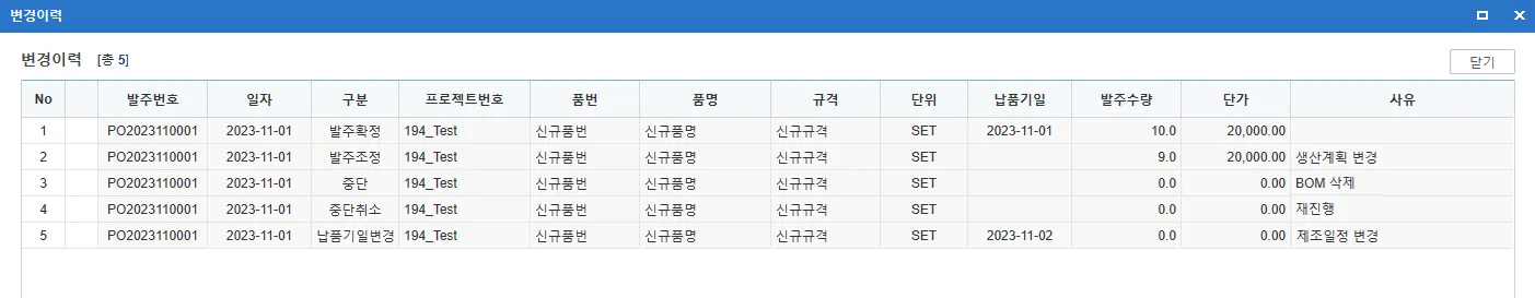 발주중단, 발주중단취소, 발주조정, 납품기일변경 등의 이력 조회