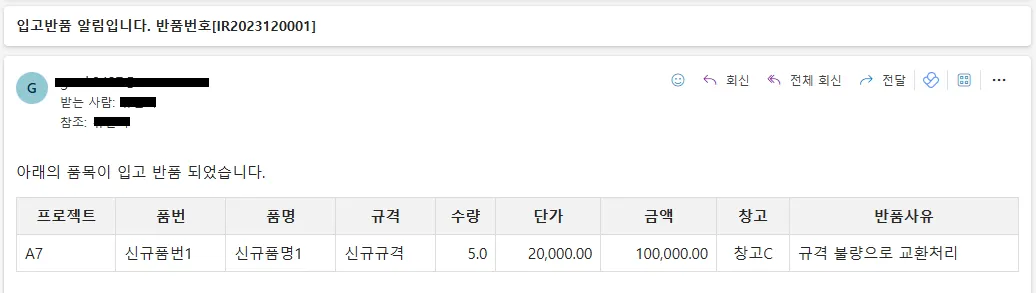 거래처로 반품 메일 보내기