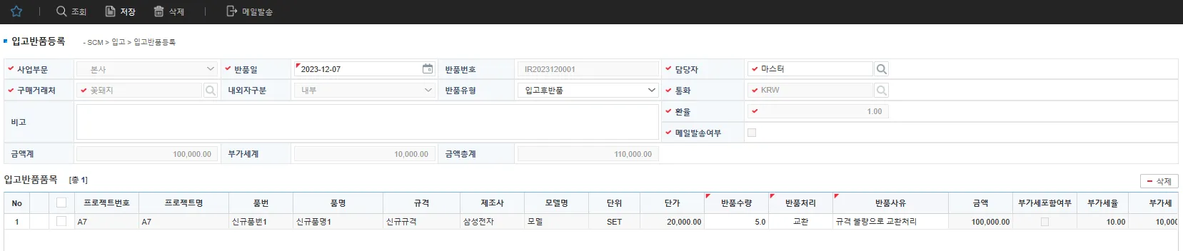 사업부문, 반품일, 구매거래처, 담당자, 통화, 환율