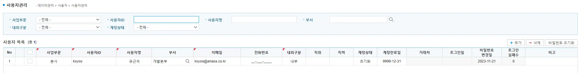 사용자의 등록 및 수정, 비밀번호 초기화 등을 할 수 있습니다.