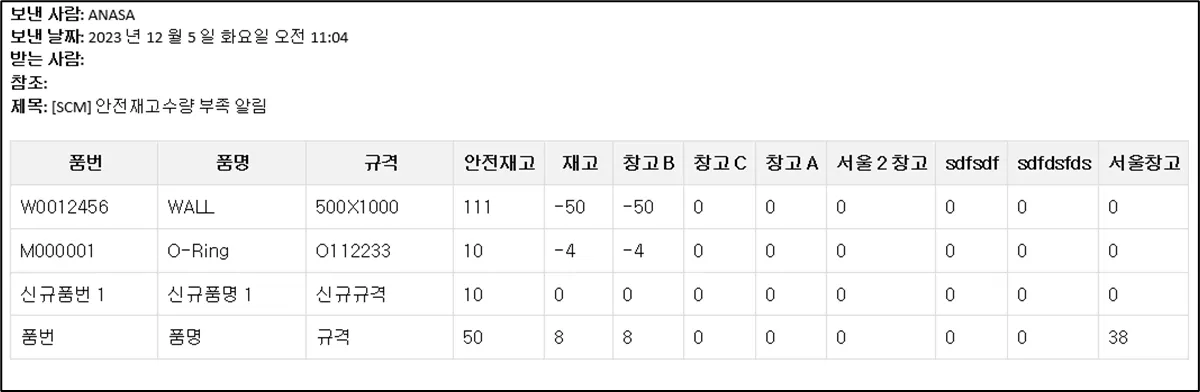 메일수신자 : [운영관리 - 품목 - 안전재고알림 메일수신자]