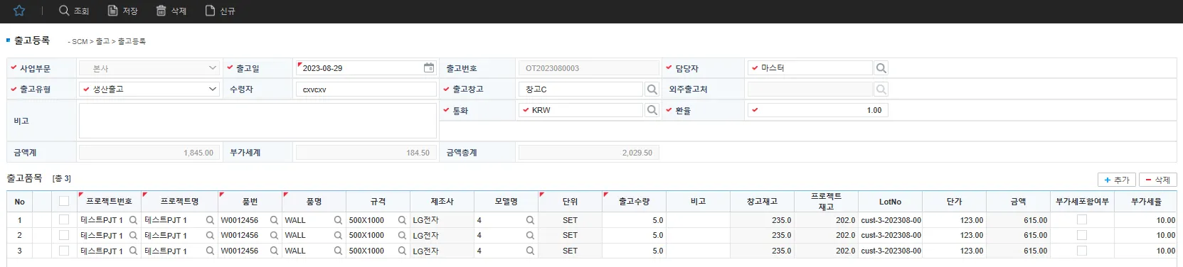 출고품목 : 프로젝트번호, 프로젝트명, 품번, 품명, 출고수량