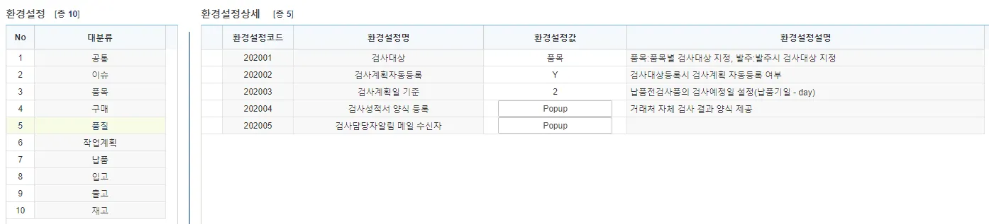 검사담당자알림메일수신자 : ‘검사계획자동등록’을 사용하는 경우 [검사계획등록]에 ‘검사계획일’은 자동입력되나 “검사담당자”는 누락되어 있음을 메일 알림