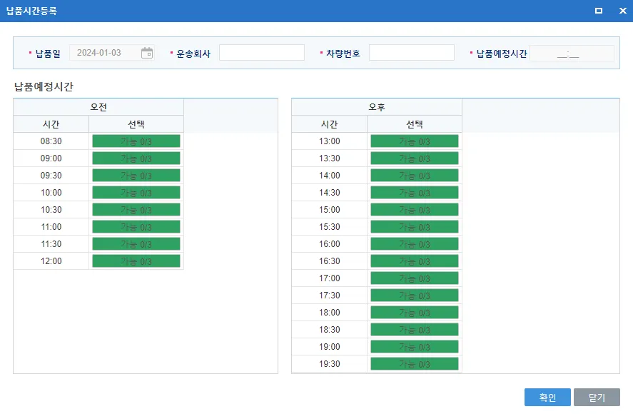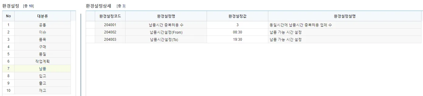납품시간 중복허용 수 : [납품등록] 화면에서 ‘운송종류’가 “화물”인 경우 동일 납품시간대에 몇개 업체를 허용할 것인지 설정