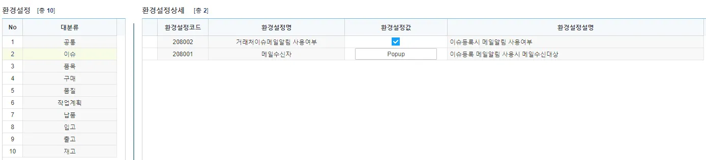 거래처이슈메일알림 사용여부 : 이슈 등록시 ‘메일수신자’로 알림메일 사용여부
