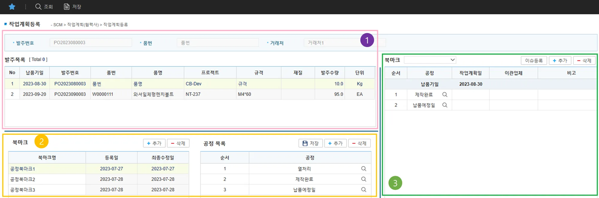 발주시 설정한 작업계획대상품목에 대해서 협력사에서는 진행해야할 작업(공정)의 계획을 등록해야 합니다.