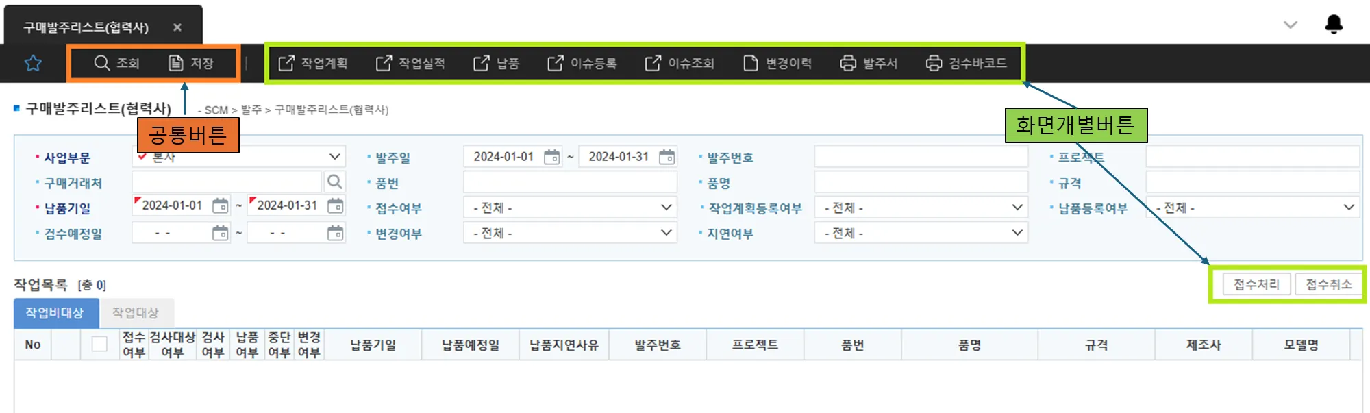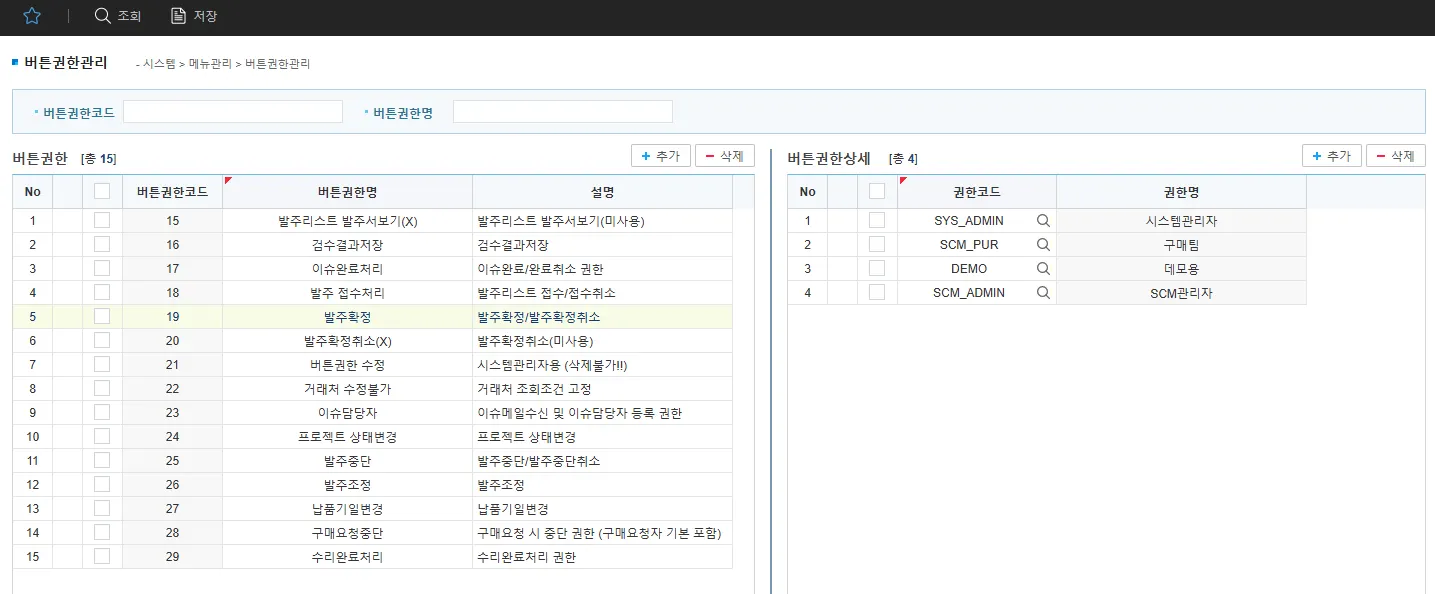 화면에서 사용하는 개별버튼에 대한 권한 설정이고, 공통버튼의 권한은 [권한별메뉴등록]에서 설정할 수 있습니다.