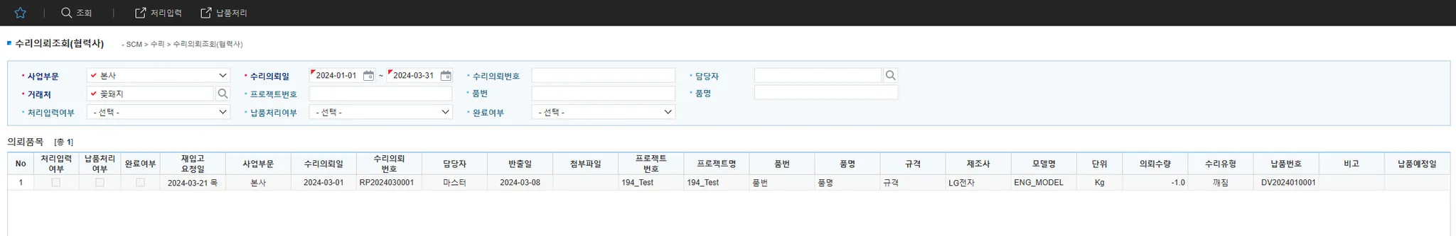 협력사에서 수리의뢰건을 조회하고 처리입력을 위한 화면으로 Jump 및 납품처리를 할 수 있습니다.