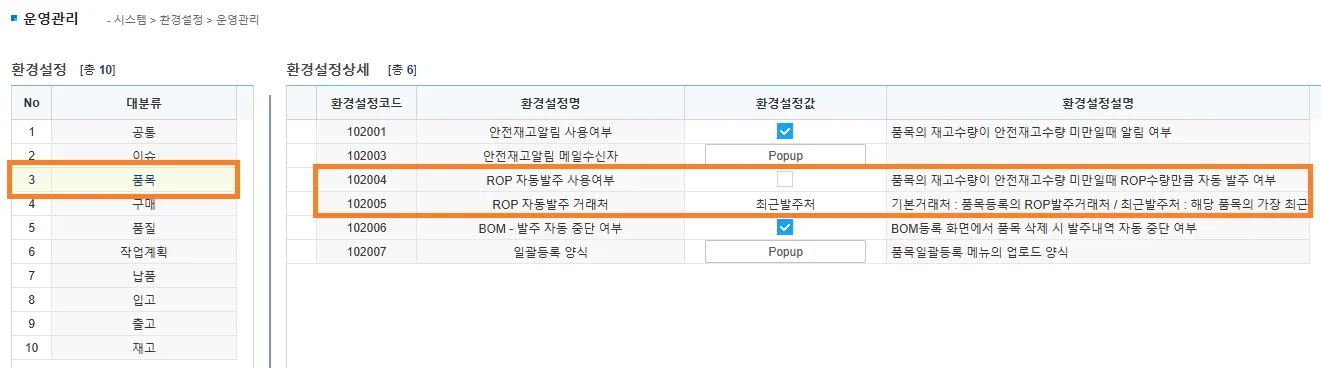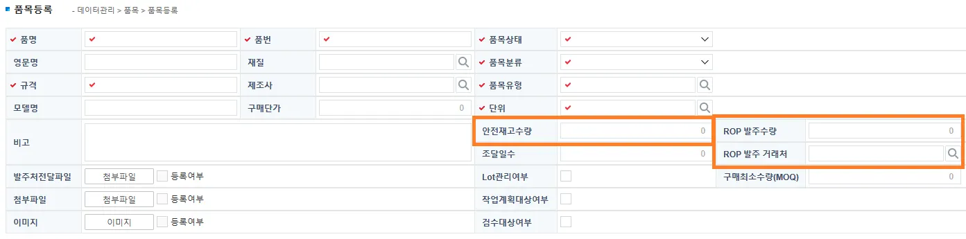 [품목등록 - 안전재고수량/ROP발주수량/ROP발주거래처]가 입력된 품목