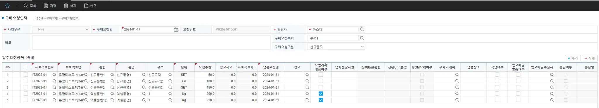 구매요청품목 - 프로젝트번호, 프로젝트명, 품번, 품명, 단위, 단가, 요청수량, 납기요청일