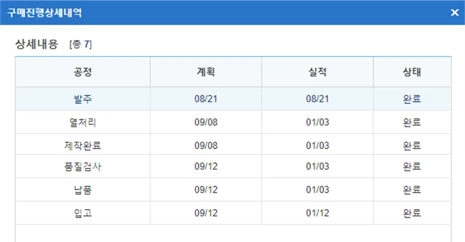 납품완료 : 발주수량만큼 납품이 등록된 상태 (발주수량 = 납품수량)